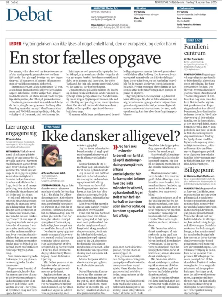 Dette er mit første bidrag i Nordjyske. Her var der en konkurrence i den organisation, som jeg er medlem af; Europæisk Ungdom. Man kan vinde en tur til FNs hovedkvarter. Selvom jeg ikke oprindelig er europæer synes jeg alligevel det er både spændende og hyggeligt at møde unge fra hele Europa. Der er diverse arrangementer i form af debatter, foredrag, workshops mv. – Selvfølgelig også spisning.